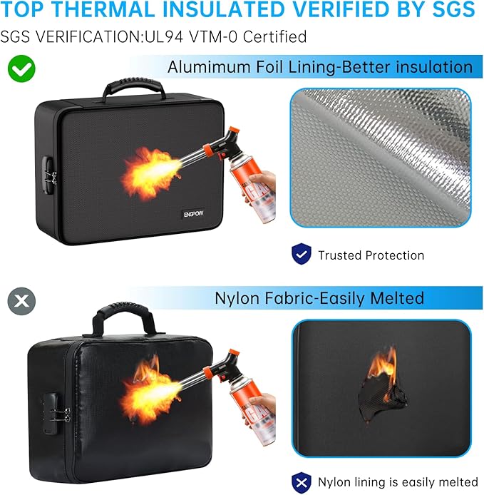 - Fireproof and Water-resistant: The multi-Layer file organizer is made of silicone coated material and aluminum foil which withstand the temperature up to 5200℉(double safe protection).Aluminum foil lining isn’t easily melt under high temperature after several tests. It has been passed by SGS TEST(UL94 VTM-0 Certified).The bag is fireproof and Water-resistant, which can effectively protect your important documents in a fire, flood, and wet weather. They will further keep your files intact.