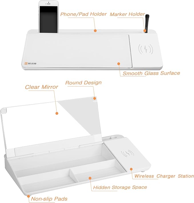 - 📳MULTIFUNCTIONAL: Storage+Wireless Charging+Write+Hold iPad/iPhone+Keyboard Stand+Built-in Mirror, our desktop white board is an all in one multipurpose board. Equipped with black dry erase markers, eraser and 3ft USB Type C cable.