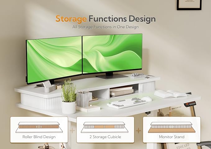 - 2-Tier Shelf Stand - Claiks standing desk with storage and unique roller shutter door design. Provides you with a more ergonomic way to view your monitor.