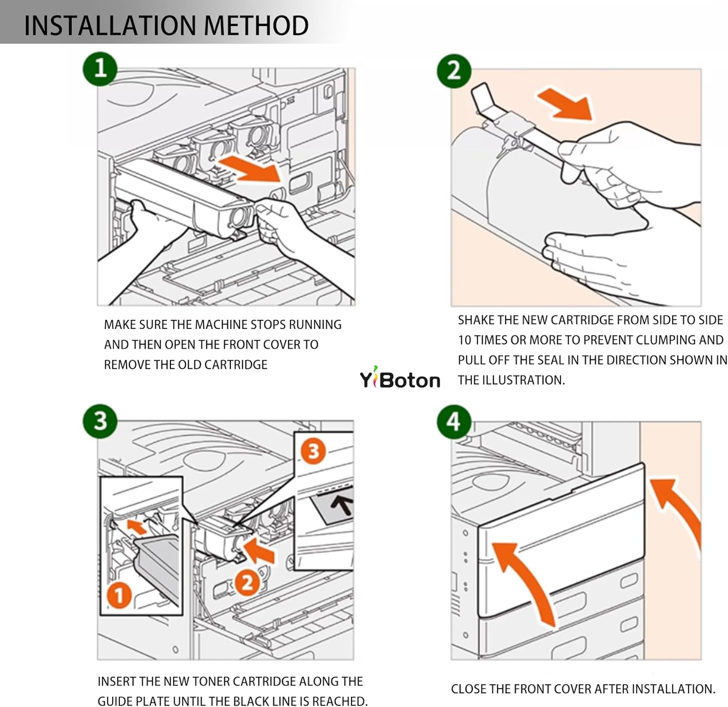 - Installation method: Take out the old toner cartridge of the corresponding color, shake the cartridge horizontally 2-3 times to make the toner uniform, and put it into the printer to use