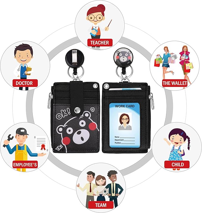 Cute ID Badge Holder Retractable Lanyard Reel Clip with Heavy Duty Carabiner, 5 Card Slots in 2 Sided with Key Ring and Zipper for Women Students Teens Girls Office Staff (Black OK Bear)