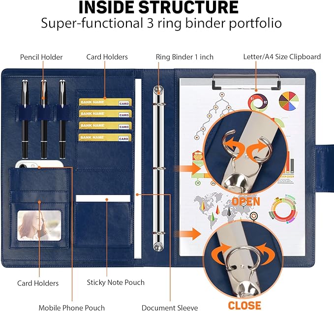 - Practical Structure: Toplive 3 ring portfolio binder designed with 1 side document sleeve, 6 card holders, 3 elastic pen loop, 1 memo pad pouch ,1 cellphone holder, 1 clipboard and 1 metal 3 ring binder (1inch). Keep organized and professional during a business trip, an interview, a conference or presentation etc.