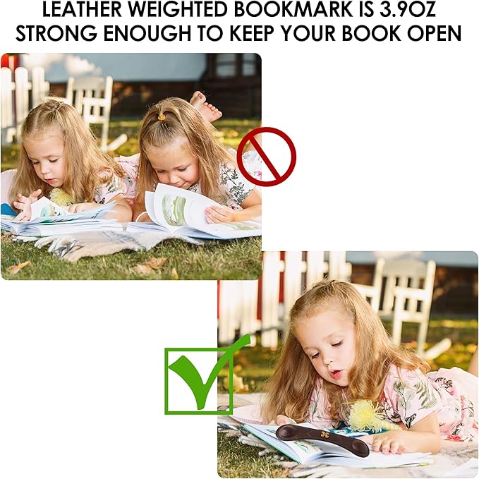 - Book Accessories Set - 1Pcs Coffee Book Weight Page Holder and 3Pcs Bookmark Corner. Book open holder has weighted ends to keep your cookbooks workbooks paperback and textbooks open and in place for hands-free reading. Bookmark Corner, two ways to use. You can just put the leather bookmark in the footer after reading. In addition, you can also put the bookmark corner in the book, which is convenient for you to open the page you read last time and continue reading. Exquisite gift box packaging.