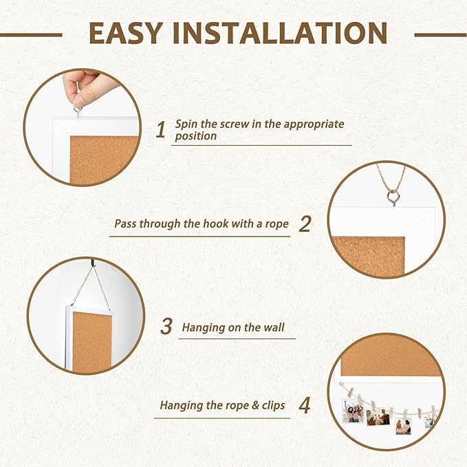 - [Easy Installation & Value Set]: The 16" x 12" wood framed corkboards for wall set comes with 10 push pins, 10 clips, 2 linen rope and basic wall mounting hardware. Install the mounting accessories on the wall and then decorative double-sided cork board can be hung on the wall vertically or horizontally as you like.