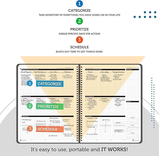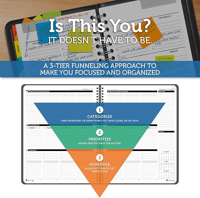 - EXCLUSIVE 3-TIER FUNNEL DOWN approach helps you prioritize and organize all that matters. Section 1- CATEGORIZE is to inventory everything you have going on. Section 2 - PRIORITIZE items from section 1 to specific days for attention. Section 3 - SCHEDULE is to block out time for tasks from section 2