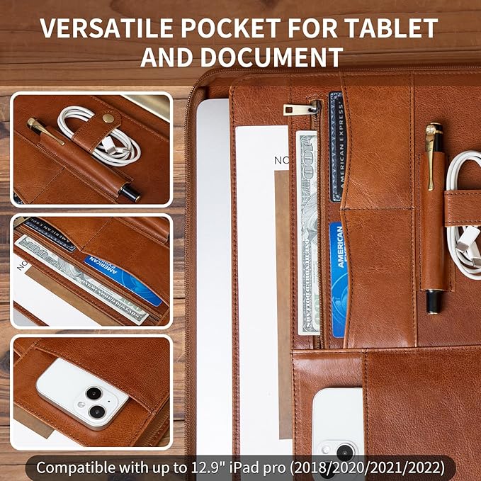 - PREMIUM GENUINE LEATHER– Vintage crazy-horse cowhide leather, The scratches, wrinkles and fingerprints left during use will make your folio more and more retro. Process:Handmade. Accessories:Double YKK zippers, for great safety and ultimate organization.