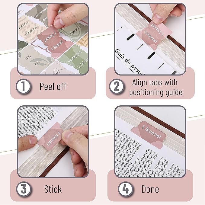 - With their large, clear font and bright printing, these Bible tabs offer a convenient organizational tool for those looking to engage in Bible study or journaling.