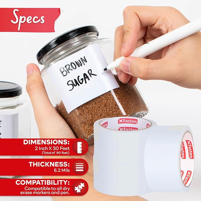 XFasten Dry Erase Tape White 2-Inch x 30-Feet (3-Pack 90 Feet Total) Zero Smudging Ghosting-Free Whiteboard Tape, Reusable Dry Erase Labels for Storage Bins, Sentence Strips for Teachers