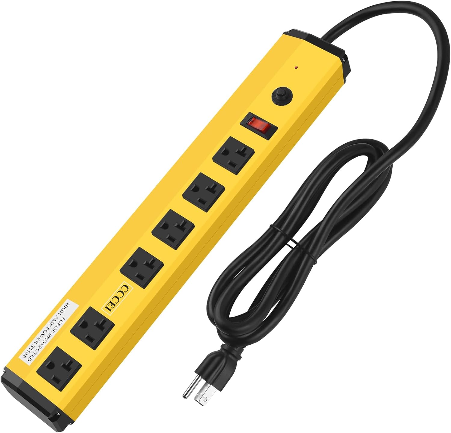 CCCEI Heavy Duty Power Strip Surge Protector 20 Amp, High Amp Industrial Shop Garage Metal Multiple Outlets, 10 FT Yellow Jacket 12 Gauge 5-15P Extension Cord 6 Outlet 6-20R T-Slot 20a for Appliance