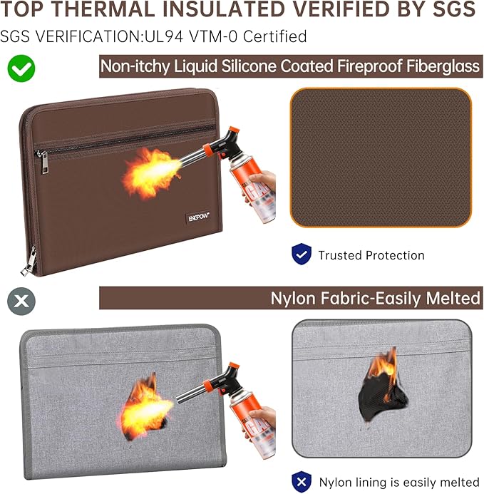 - High-Quality Materials: Protect your files with ENGPOW fireproof accordion file folder.It is made of non-itchy silicone-coated fiberglass which withstand the temperature up to 2000℉.It has been passed by SGS TEST(UL94 VTM-0 Certified).Fireproof File Folder is fireproof&Water-resistant,which can effectively protect your important documents in a fire,flood,and wet weather. They will further keep your files intact.Giving you time to save your important documents when disaster strikes.