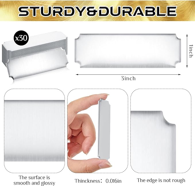 - What You Will Receive: you will receive 30 pcs of custom name tags, which can meet your daily life needs, they are not suitable for mechanical engraving, only for laser engraving; Please pay attention to the model and power of the machine; Too much power will damage the label, too little power will not be able to engrave the words; You need to pay attention to whether your machine is suitable for laser engraving of ordinary metals; Some machines may not be able to engrave all types of metals
