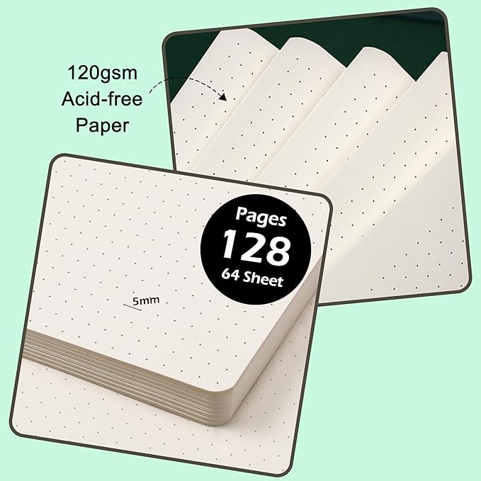 - PREMIUM THICK PAPER - 120 gsm dotted paper, our notebook journal is made of high quality acid free paper to help prevent from damages of light and airs to keep notes on the pages clearly. There are 128 pages/64 sheets in this ruled journal, which provide you with plenty space for planning or scheduling.