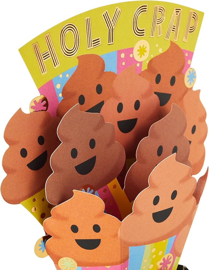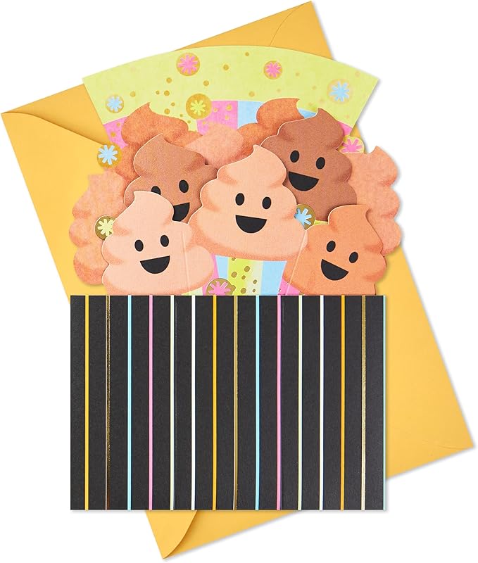 - Funny pop-up greeting card features a hilarious three-dimensional design of a chorus of smiling poo emojis on a colorful striped base paired with a message of amazement and a mini-card that opens with space for a personalized message. Die-cut design and foil accents.