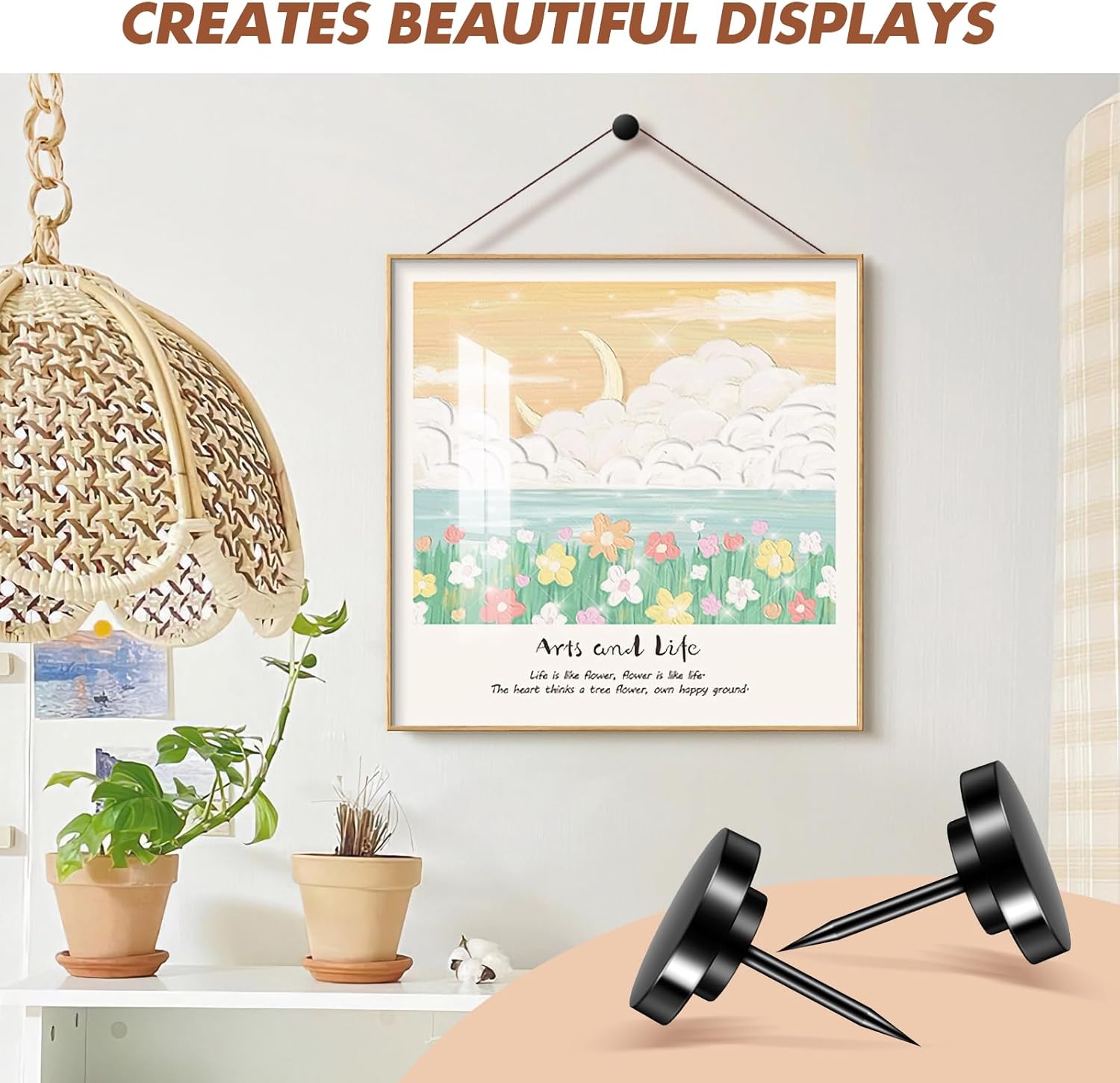 - 【Versatile Hanging Helper】Thumbtacks provide a versatile solution for your wall décor needs. To hang a variety of items, such as paintings, clocks, pictures, key chains, mirrors, photos, or other ornaments, versatile and practical, Whether you're hanging picture frames, tapestries, other wall decorations, or using push pins for bulletin boards and walls, you can trust these wall tacks for hanging to keep your items firmly in place. Add lots of charms and elegance to your room.