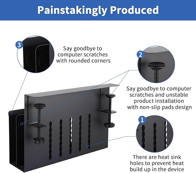 - Multifunctional Desk Side Storage & Anti -Slip And Anti -Scratch Design: This laptop holder can be retrofitted to the side of a desk to easily hold a laptop, tablet, hidden wires, interior accessories, manuals, documents, notebooks, and other items. On the inner surface of our desk side storage rack, the bottom and ends of the clamp have a non-slip sheet, which can help secure laptop in desk side hanging storage to avoid scratching desktop laptops, tablets or other devices