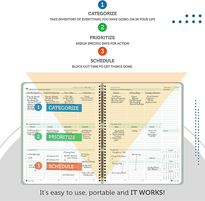 - EXCLUSIVE 3-TIER FUNNEL DOWN approach helps you prioritize and organize all that matters. Section 1- CATEGORIZE is to inventory everything you have going on. Section 2 - PRIORITIZE items from section 1 to specific days for attention. Section 3 - SCHEDULE is to block out time for tasks from section 2