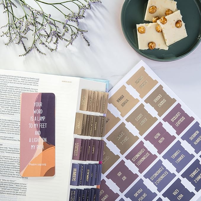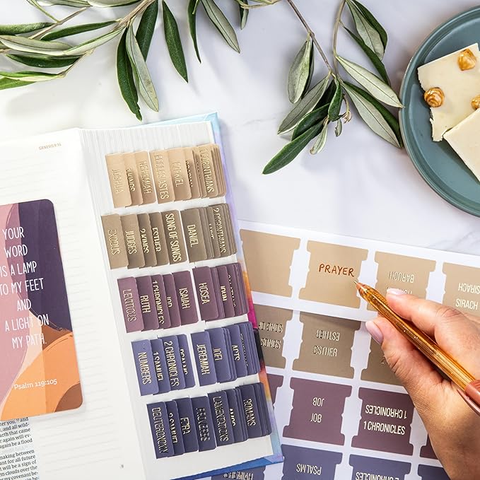 - Easy to Apply, Alignment Guide Included: The peel-and-stick Bible index tabs are self adhesive, simply align them with the provided guide or place them creatively in your new Bible. The Bible stickers are pre-scored in the middle for easy folding.