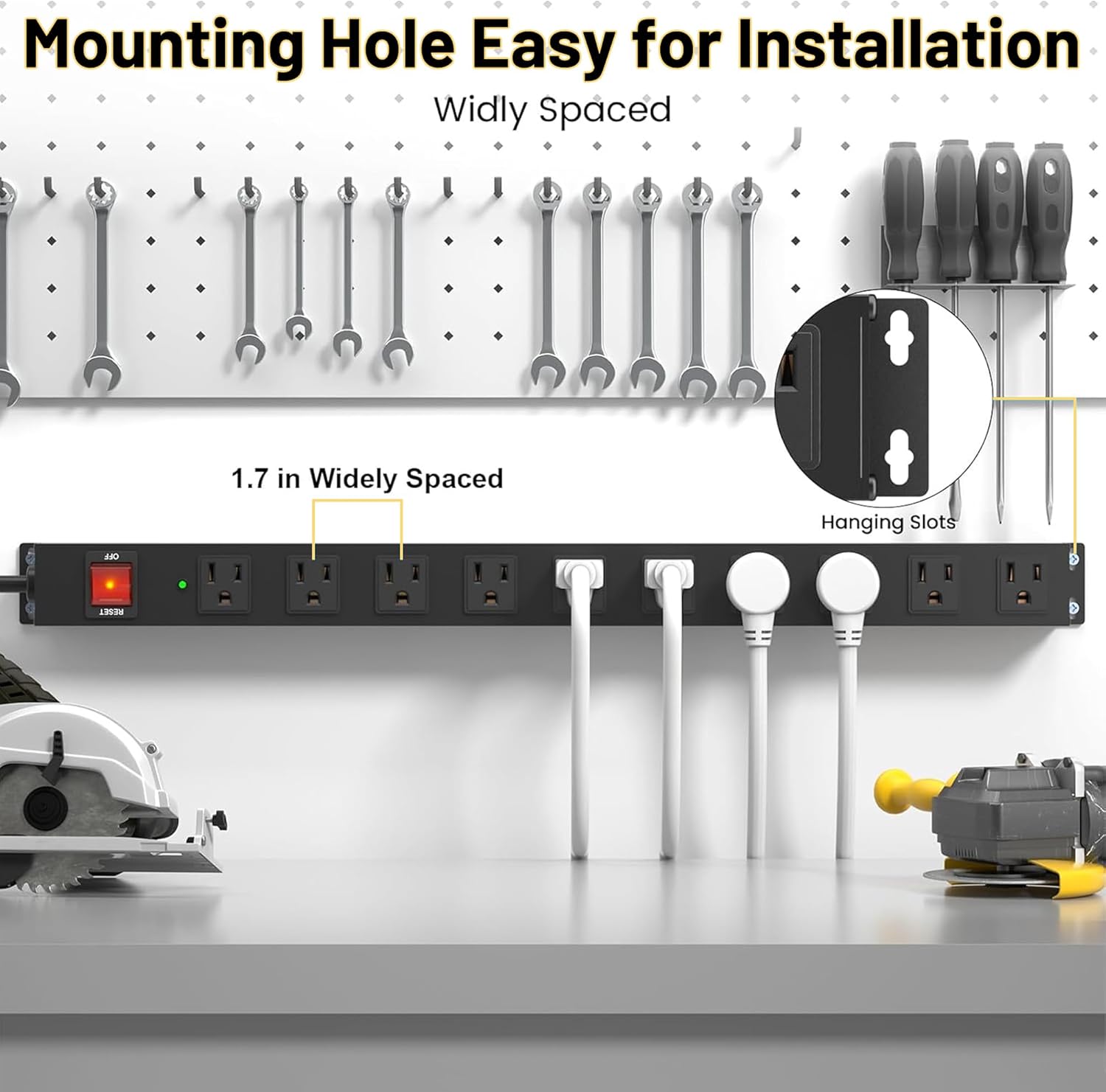 - Wall Mount Metal Power Strip: Mounted it on the wall or under-desk mounting on standing desks, making it perfect for your garage, office, or industrial setup. Whether it's at home, in an office, or in an industrial environment, this power strip is designed to meet your diverse power needs, catering to different settings effectively.