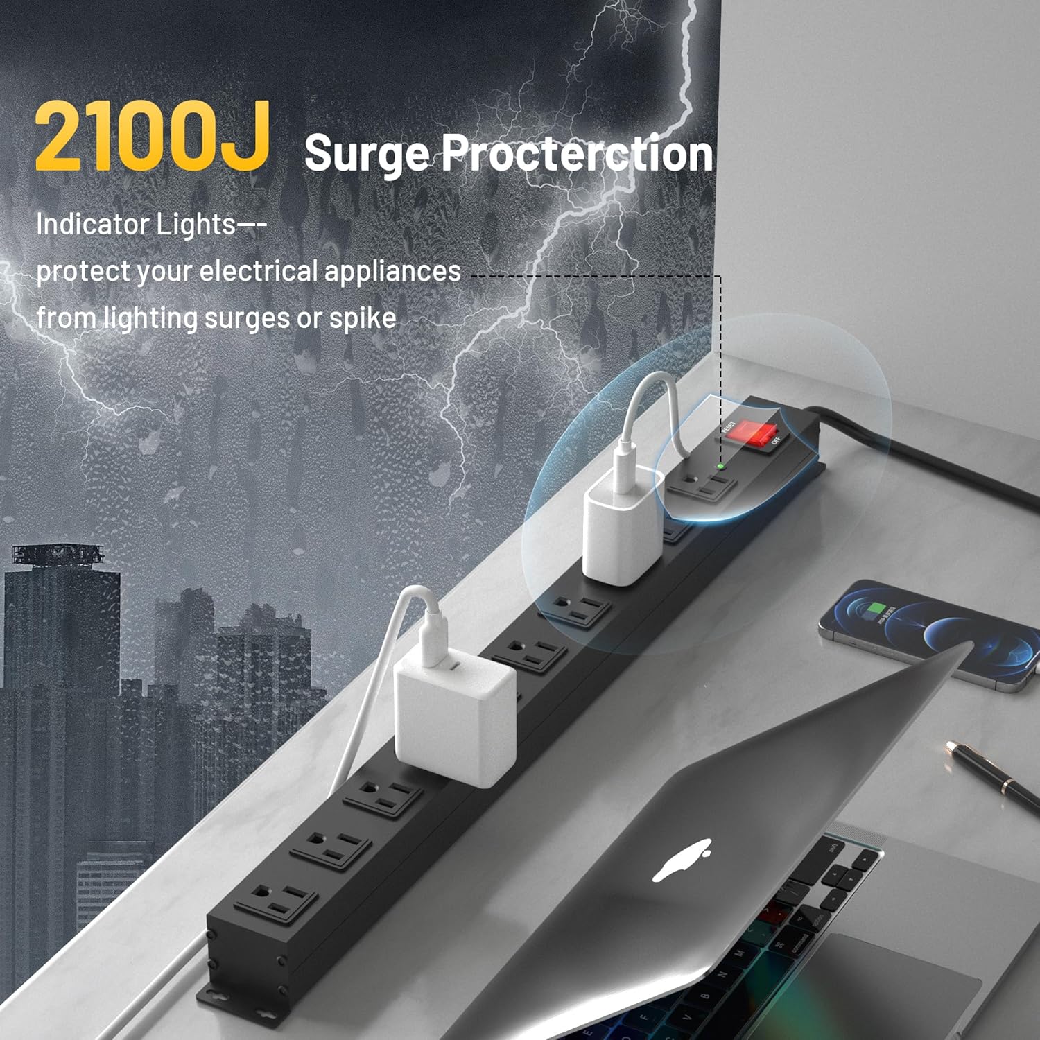 - 2100J Surge Protector: With a high 2100J surge protection capability, our heavy-duty power strip offers exceptional reliability, ensuring your devices are adequately powered and protected from unexpected power surges.