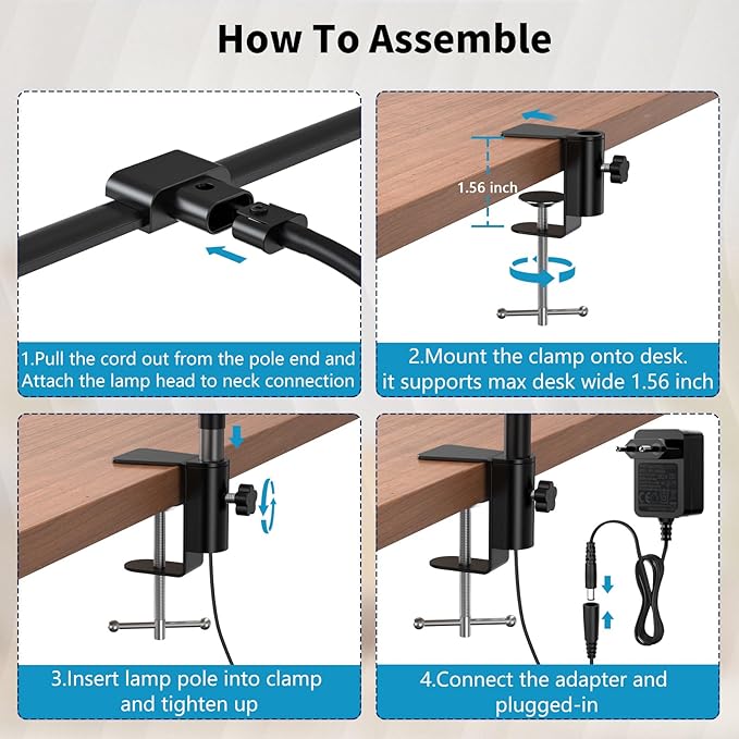 - Space Saving Separated C Clamp: This tall desk lamp comes with a separated C clamp allows it clamp-onto the max desk wide 1.7-inch and it takes up absolutely no desk space, the separated design allows the lamp mounted from any direction to accommodate your different lighting needs,the great solution for working from home