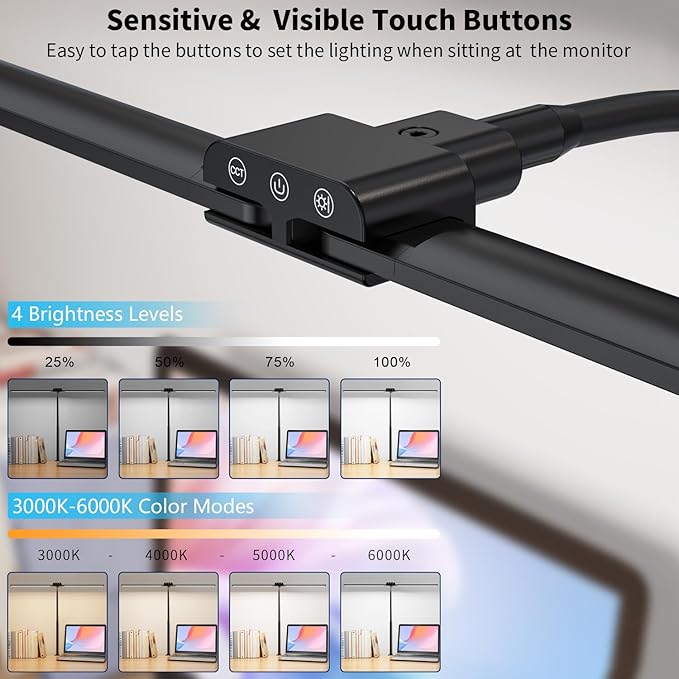 - Easy Operated Front Touch Buttons: The buttons are designed in front of the light bar which is visible when sitting at the table and smooth to switch the light modes: 4 brightness levels and 4 color modes. It also equipped with 30-min auto off timer long press power button till the light flash once, the timer activates