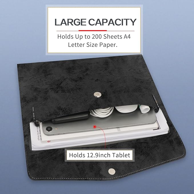- Large Capacity: Toplive envelope folder can hold up 150-200 sheets A4 / letter size documents or papers. It also can contain your tablet up to 11" and something you need. The grooves on either side can insert 2 pens to meet the needs of use.
