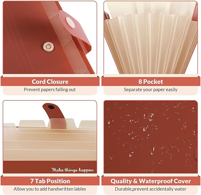 SKYDUE File Folder with Labels, Accordion File Organizer with 8 Pockets, Portable Document Organizer, A4 Letter Size, Paper Organizer for Office, Brown