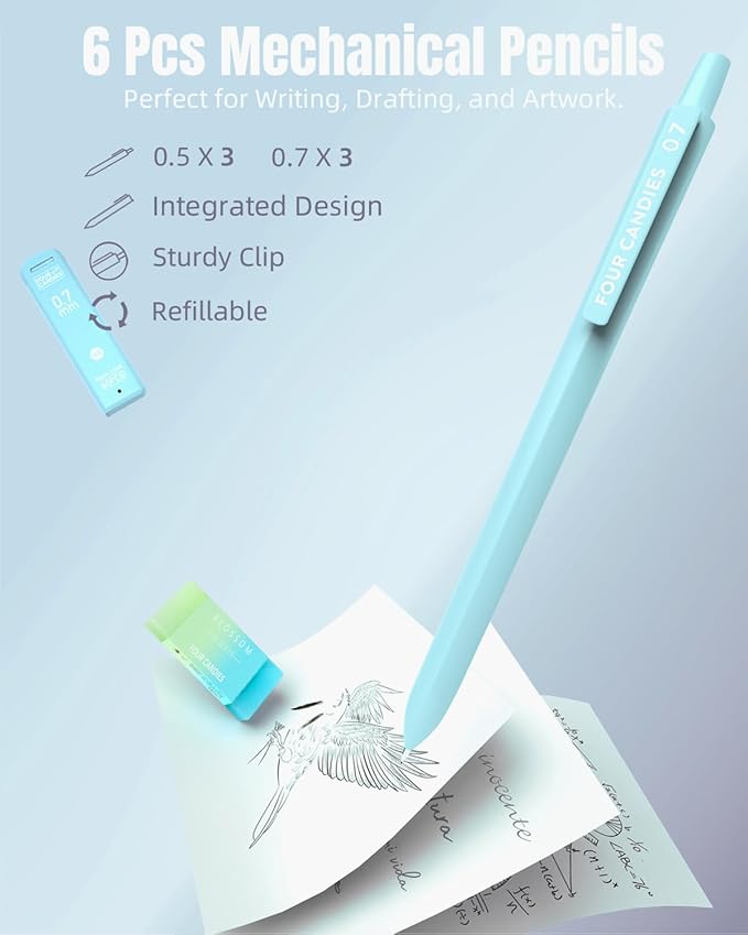 - 6PCS Mechanical Pencils Set for Artists: This set includes 3 pencils with 0.5 mm leads, 3 with 0.7 mm leads, 6 tubes of #2 lead refills, 3 jelly erasers, and 9 cap eraser refills; The ergonomic triangular grip fosters a comfortable hold, ensuring a pleasant writing and drawing experience; Note: This set is suitable for children over 3 years old