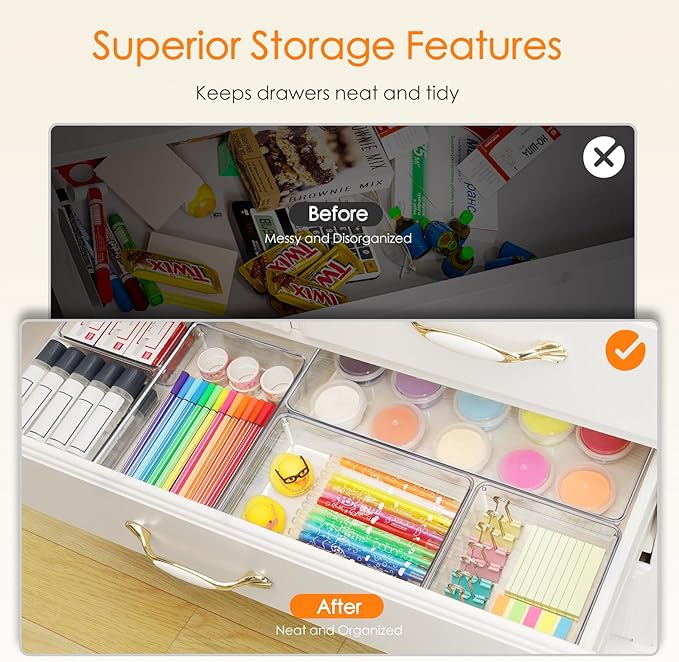 - Space-Saving: Maximize your space and keep your drawers neat and tidy with this versatile set, save your time to organize and find your stuff. When you're not using it Stack these storage boxes together so that you can save maximum space