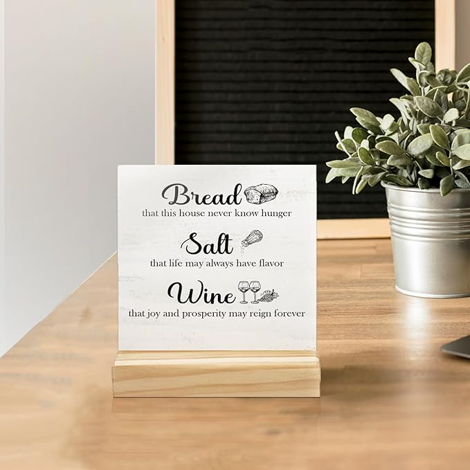 Wine Signs for Home Decor,Inspirational Desk Decor,Kitchen Decor Bread Salt Wine Wooden Sign Desk Decor for Farmhouse Home Kitchen Table Shelf Decoration, Housewarming Gifts for Woman