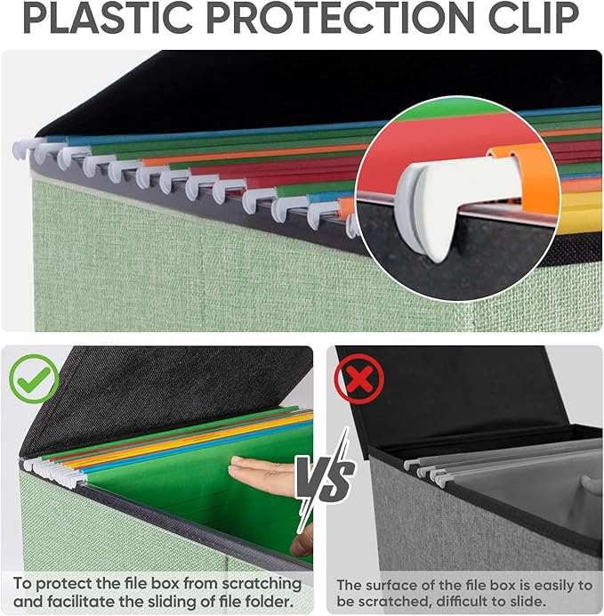 - [UNIVERSAL SIZE] Our file box with lid fits both letter and legal size files. It is designed for efficiency and functionality, with its smooth PVC slide rails on both sides, you can effortlessly slide file folders for easy access and neatly arranged. The lid can fit snugly on the box after hanging folders. (NOTE: file folders are not included)