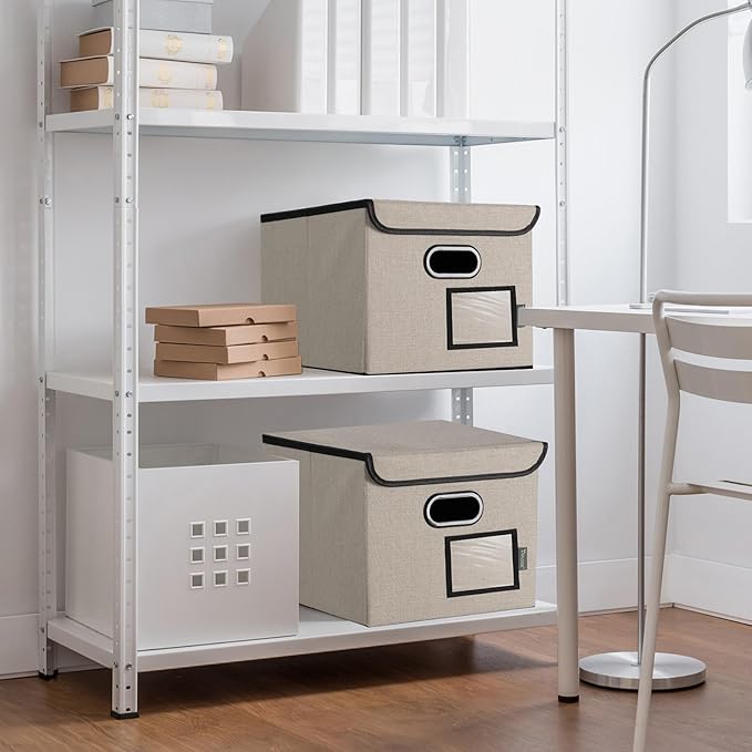 - [OPTIMIZED DESIGN] Designed with convenience in mind, our file storage box helps to elevate your efficiency and organization. The transparent label slot allows for quick identification of the contents stored inside the box. The collapsible design and sturdy handles ensure effortless storage and movement, making it convenient and easy to use.