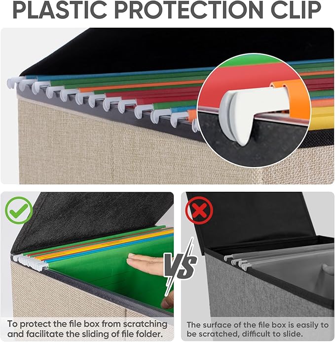 - [UNIVERSAL SIZE] Our file box with lid fits both letter and legal size files. It is designed for efficiency and functionality, with its smooth PVC slide rails on both sides, you can effortlessly slide file folders for easy access and neatly arranged. The lid can fit snugly on the box after hanging folders. (NOTE: file folders are not included)