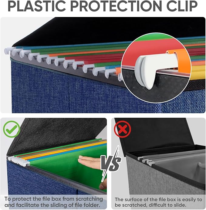 - [UNIVERSAL SIZE] Our file box with lid fits both letter and legal size files. It is designed for efficiency and functionality, with its smooth PVC slide rails on both sides, you can effortlessly slide file folders for easy access and neatly arranged. The lid can fit snugly on the box after hanging folders. (NOTE: file folders are not included)