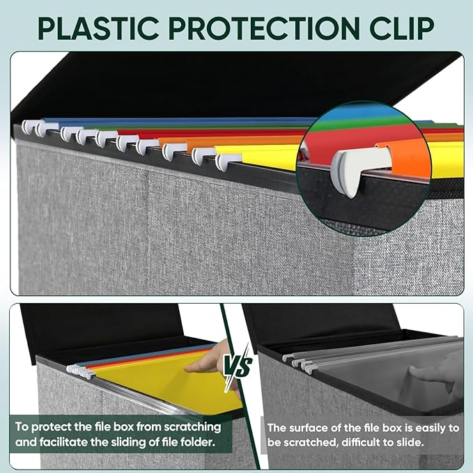 - [UNIVERSAL SIZE] Our file box with lid fits both letter and legal size files. It is designed for efficiency and functionality, with its smooth PVC slide rails on both sides, you can effortlessly slide file folders for easy access and neatly arranged. The lid can fit snugly on the box after hanging folders. (NOTE: file folders are not included)