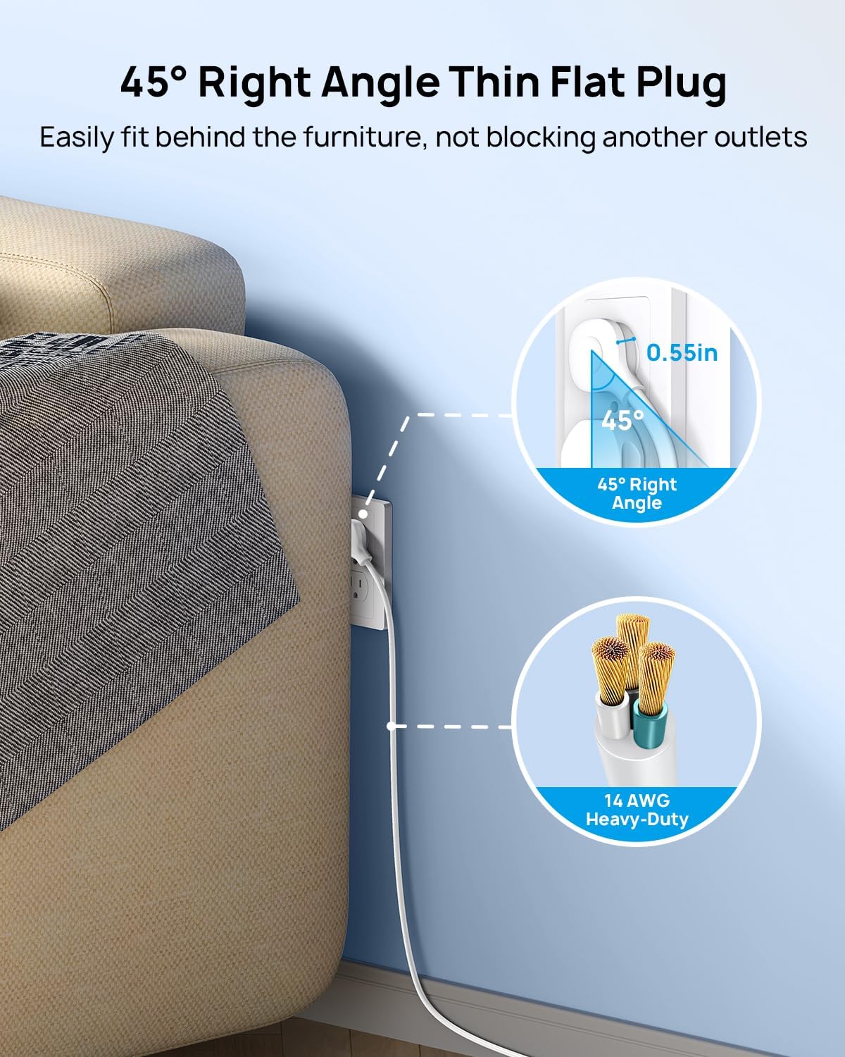- 【Flat Plug Power Strip】Our heavy-duty power strip with a 0.55in low profile flat plug easily fits behind furniture close to the wall, and the 45° angle flat plug won't block the bottom outlet, so you can make full use of wall plugs in your home. The 15ft extension cord is made of 14AWG pure copper wire, providing more current carrying capacity (15A)