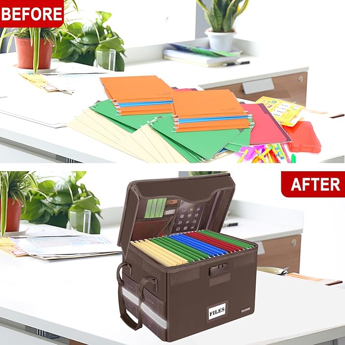 DocSafe File Box Fireproof Document Box with Lock, File Storage Organizer Box with Pockets,Collapsible Portable File Box Home Office File Cabinet with Handle for Hanging Letter/Legal Folder,Brown