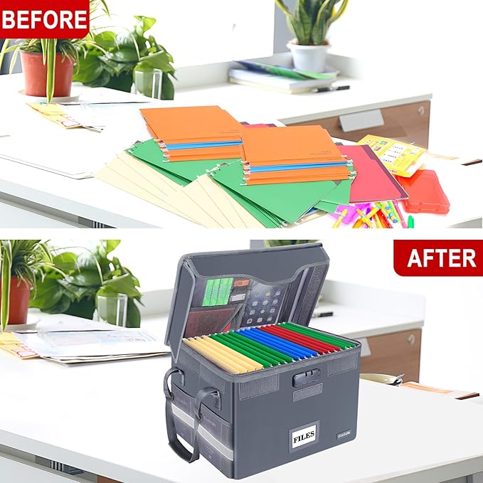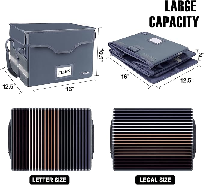 - Humanized Design: The fireproof file box collapses down simply for easier storage when not in use, you can put it in your home,office,car and other places.High quality combination lock design for added storage security. Sturdy adjustable handle makes it easy to carry everything you need, two zippers make it easier to open and close the box,label slots allow you to easily sort each box,the non-slip pad at the bottom makes the product more durable,Hook&Loop for additional protection of the box.