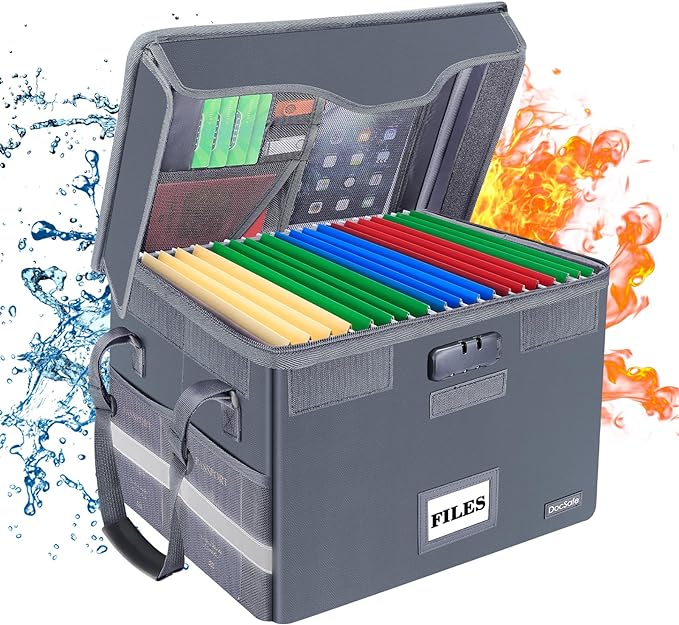 - Fireproof and Water-resistant: The new upgrade fireproof file box is made of 3 layered non-itchy silicone coated fiberglass which stands up the temperature up to 2200℉.It has been passed by SGS TEST(UL94 VTM-0 Certified).Fireproof file box is not only fireproof but also high water resistant in case it gets wet for any reason.Nothing is completely foolproof, but added protection is always a good idea. (Hook&Loop all around the zip and lock for better protection against fire/water)