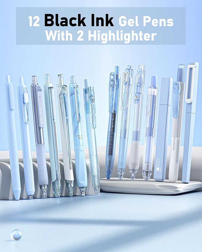 - Lovely Macaron Colors: The blue gel pens set contains 12pcs black gel ink pens and 2pcs highlighter, they come in cute macaron colors and different styles, providing users with personalized and stylish options