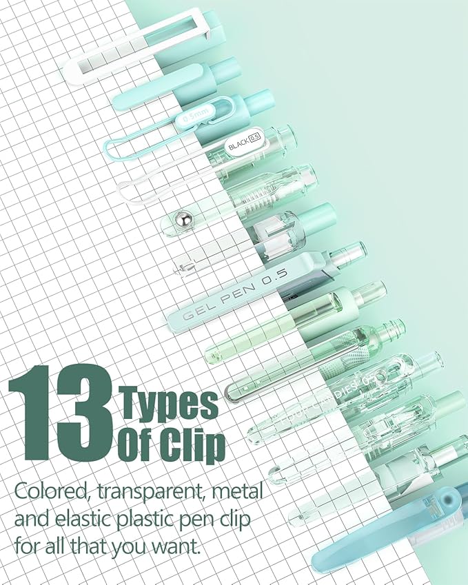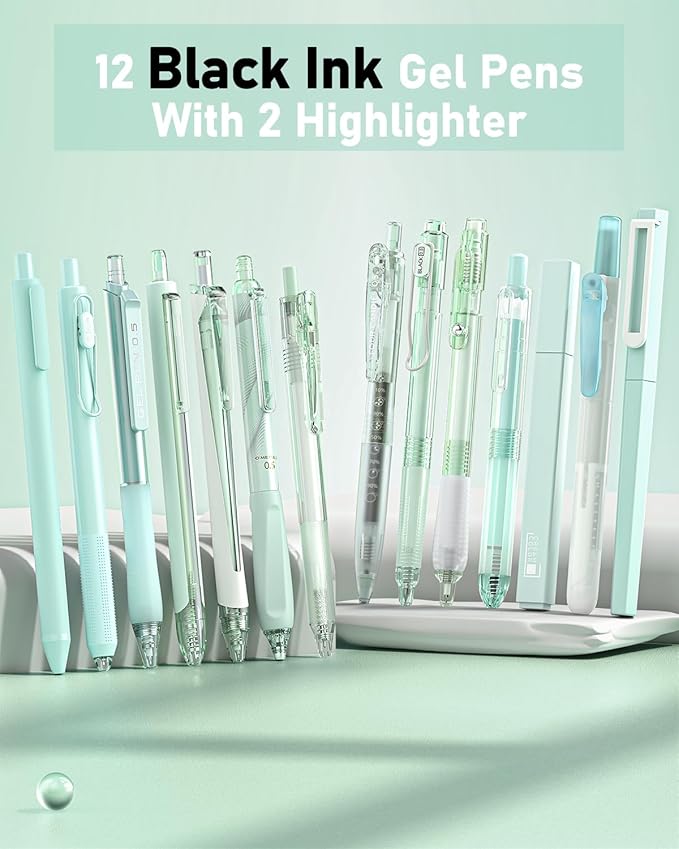- Lovely Macaron Colors: The green gel pens set contains 12pcs black gel ink pens and 2pcs highlighter, they come in cute macaron colors and different styles, providing users with personalized and stylish options