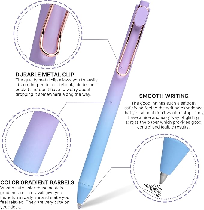 - 【Unique Gradient Colors】: 4 Gradient colors gorgeous pen barrel, and each gradient color have 3 pcs gel pens. These are such cute colors. Wow, this is the kind of pen people will want to borrow from you