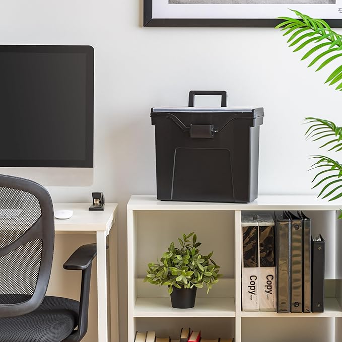 IRIS USA File Box Slim with Lid File Organizer for Letter File w/ Organizer-Lid, Water Resistant Document Box, Plastic Mobile Filing Organizer, Secure Buckle, Portable Handle, Lockable, Black 4 Pack