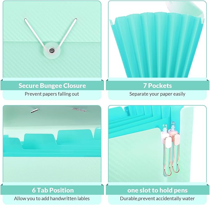 SKYDUE Expanding File Folder with 7 Pockets, Accordion File Organizer, Portable Folders for Documents, School Office Supplies Bungee Closure, Letter/A4 Size Bungee Closure, Green