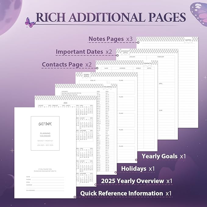 - Elevate Your Organization with Our Professional Design Planner: Maintain year-round organization with monthly and weekly pages spanning from Jan 2025 to Dec 2025 ,all presented in a clear and easily readable format. This planner is equipped with essential sections for personal information, a yearly overview, goal setting, important dates, holidays, contacts, and notes, facilitating seamless planning and enabling efficient time management