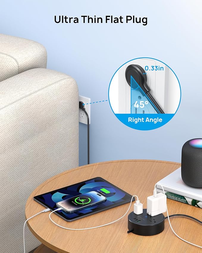 - Power Strip Flat Plug: This ultra flat plug power strip is built with an extremely flat slimplug (only 0.33” thick), which can close to the wall easily, and hide in the back of furniture. 45° angled flat plug eliminates awkward cords from cluttering indoor décor and doesn’t block the bottom receptacle