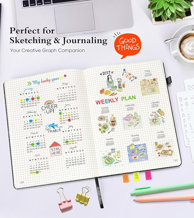 - 【180°Lay Flat Graph Journal Notebook】The 180° lay flat design makes writing easier, reading more convenient, and taking notes more efficient.At the same time, the squared notebook is designed with1 elastic closure band & 1 elastic bookmark band. to make it tightly closed to protect your content, and the inner paper will not be curled and kept flat.