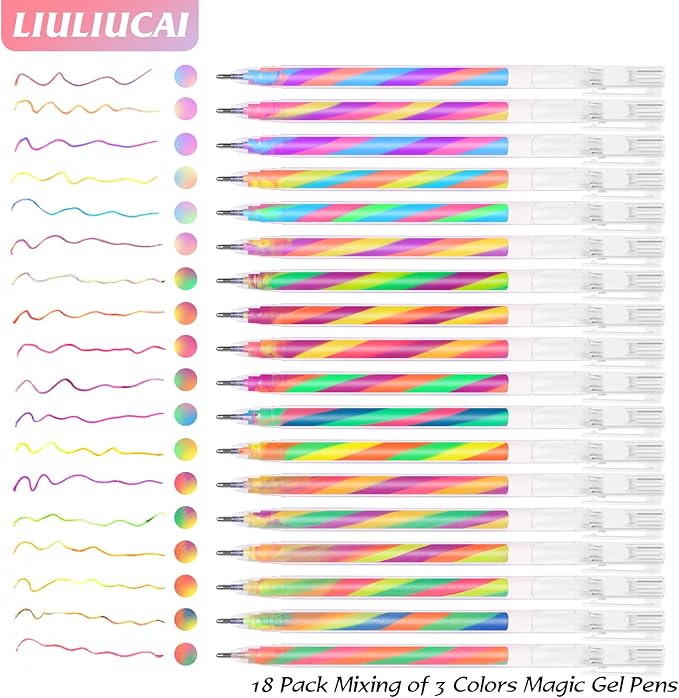 - Magical Rainbow Link-18 pcs rainbow gel pens, including 6pcs glitter,6 pcs neon,6 pcs pastel.These pens can write with different colors.Each pen color is a mixture of three colors.Turn ordinary diaries or notes into gorgeous ones with amazing spiraling colored rainbow.This will very cool!