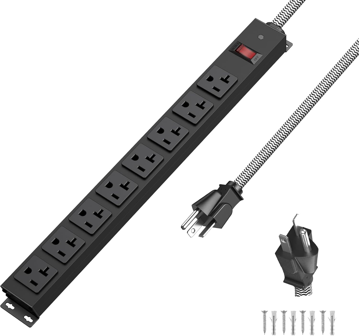 20 Amp Power Strip Heavy Duty, 12 Gauge Extension Cord for Appliance Workbench Garage Industrial, Metal 8 Outlets Combine with T-Plug Adapter 5-20R T-Slot, 1200J Surge Protector