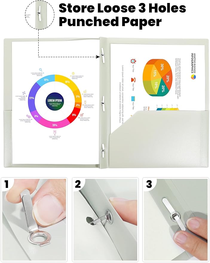 - CONVENIENT TO USE: 2 pocket folders with fasteners for 3-hole punched paper. Quickly add 3-hole punched paper in our easy-to-use 3-prong design. The outer edges of the pockets are heat sealed so that you can easily insert/remove paper from the PP 2 pocket folder.